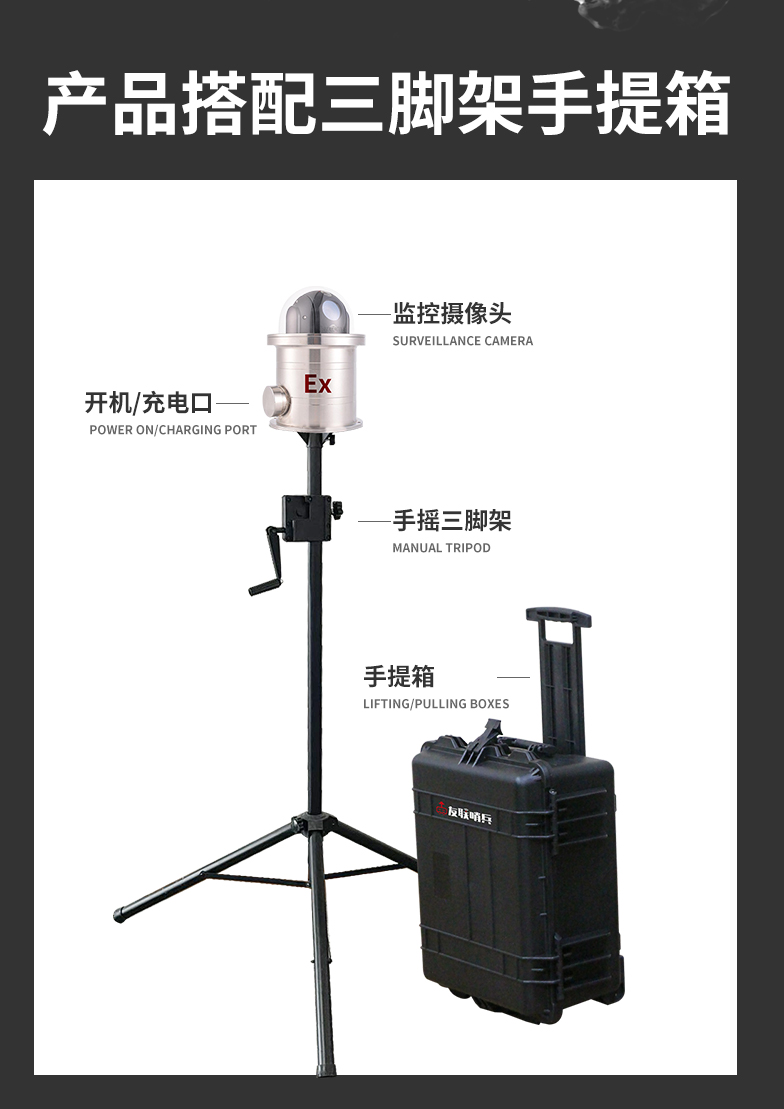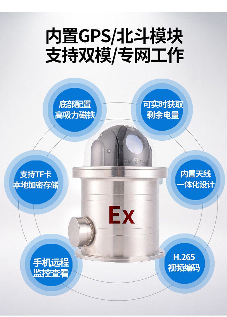 友聯(lián)哨兵5G防爆布控球是一款具備防爆功能的5G布控球產品,專為特定行業(yè)(如石油、煉化、化工、燃氣等危險化學和易燃易爆行業(yè))設計。產品內置高清攝像機及高性能鋰電池組,通過5G等無線網絡方式回傳至控制終端,具備防水防震防爆等特性,攜帶便捷,可快速安裝和收納,完全滿足石油、化工等作業(yè)區(qū)的移動巡檢、無人值守、臨時監(jiān)控、應急指揮的應用需求。
