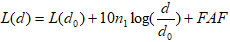式中,n1 是位于同一樓層上的路徑損耗指數,它取決于建筑物的類型,其典型值是2.8;FAF 是樓層衰減因子,它是樓層數和建筑物類型的函數。